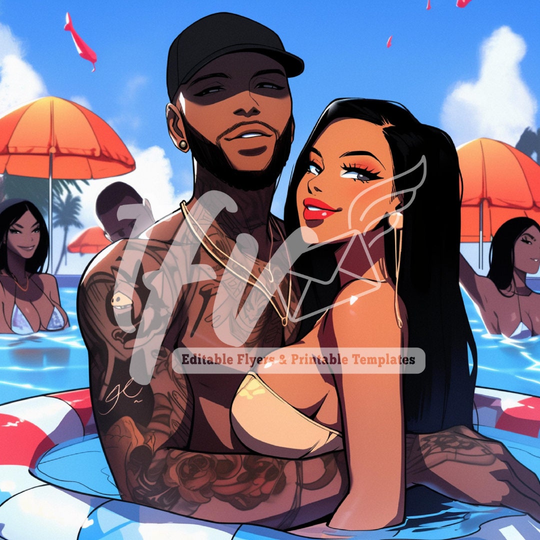 Black Love, Black Couple, Pool Party, Instant Download, Digital Art Prints, Digital Art, Young Couple, Hip Hop Art, Png, Illustrations, Jpg